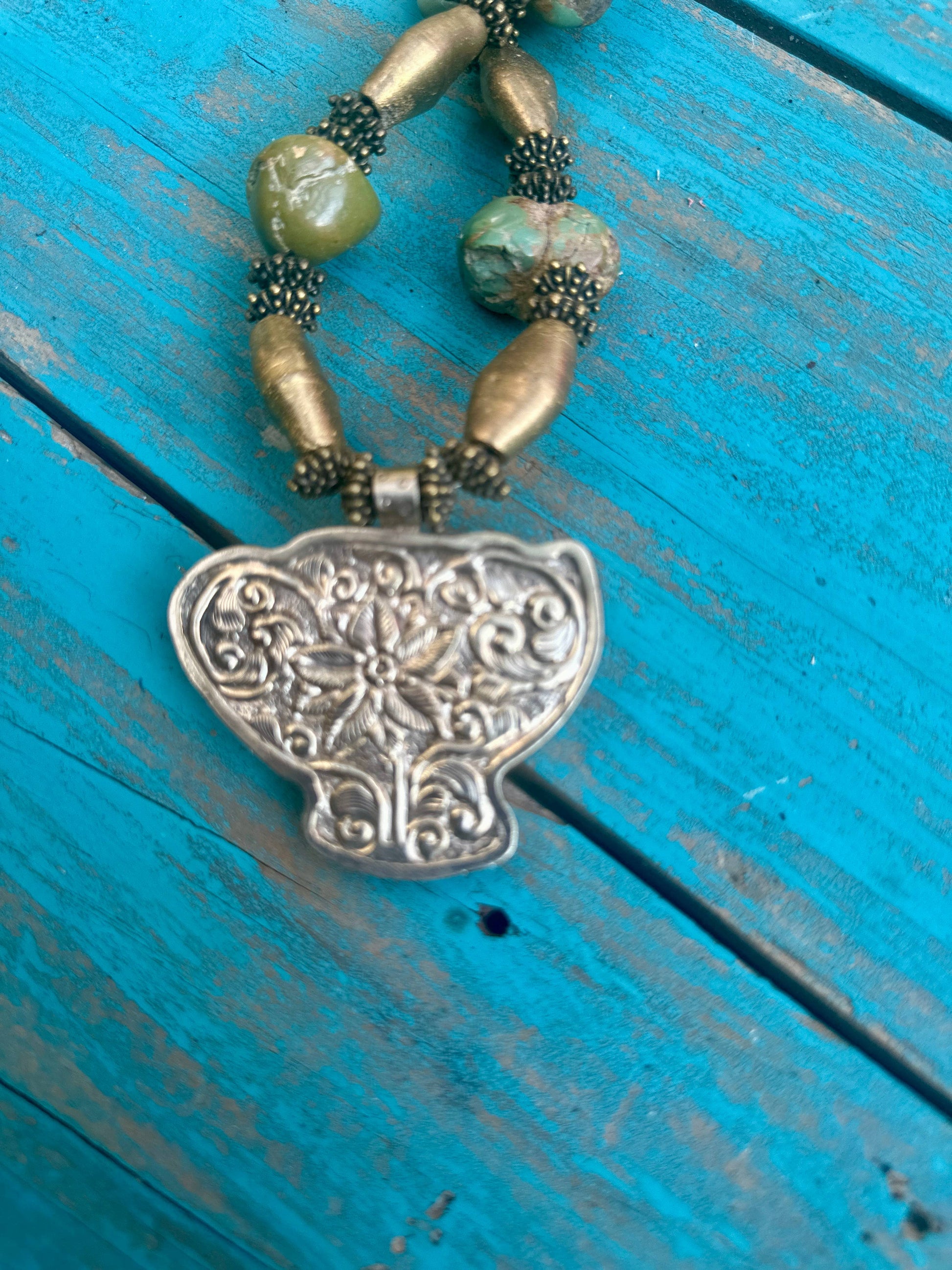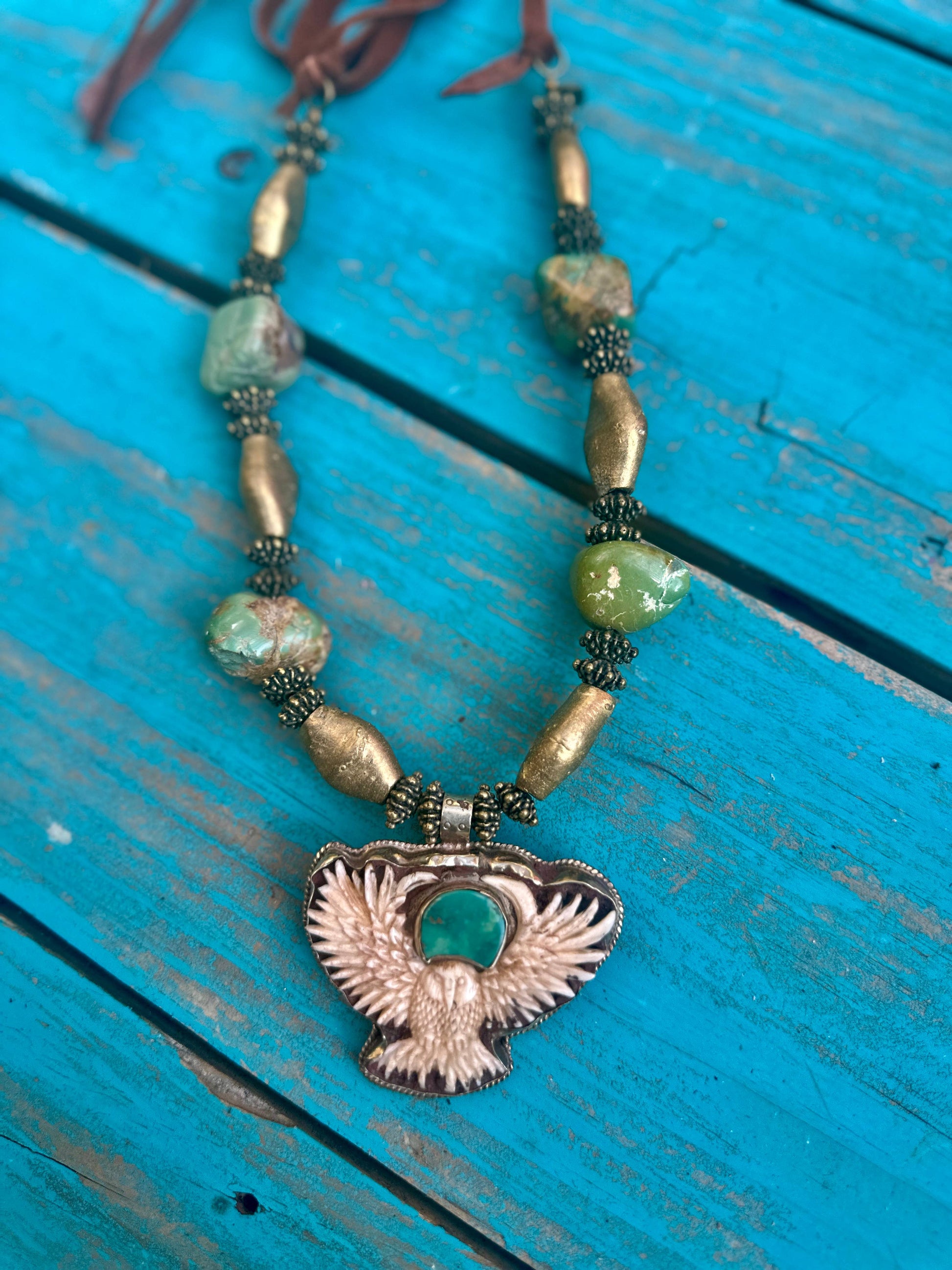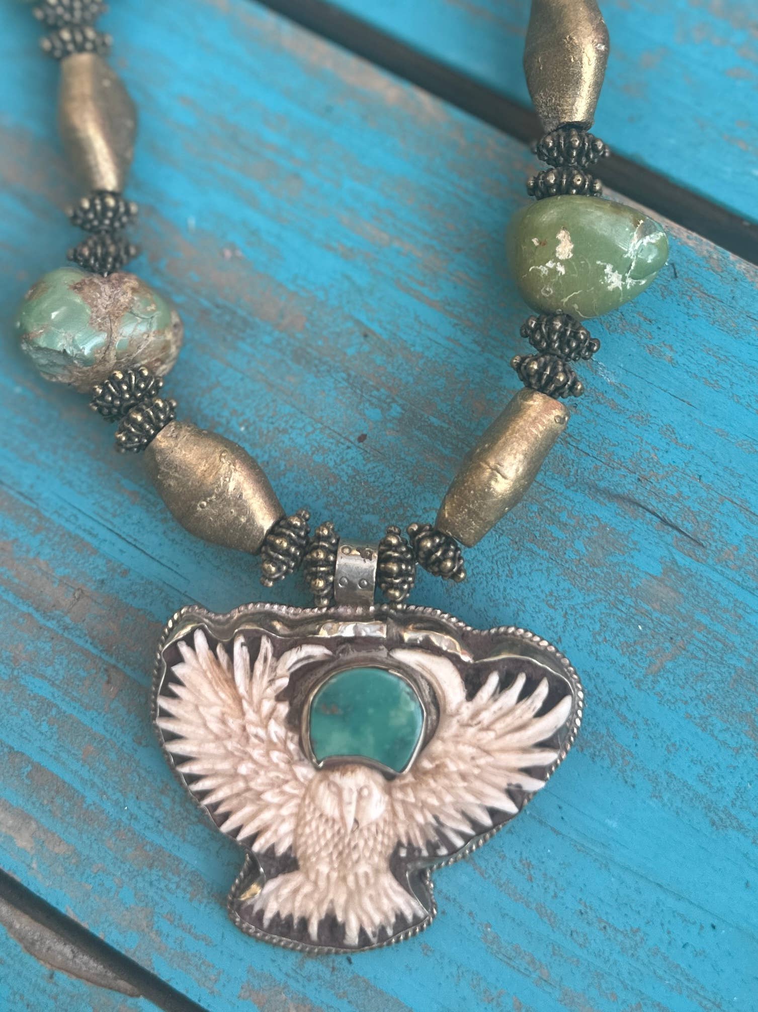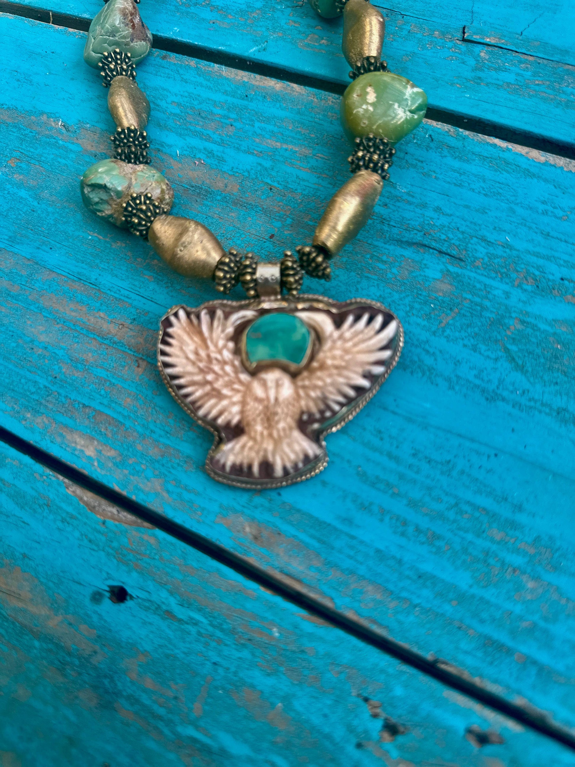 Hand carved especially for Rare bird, this eagle is in flight and ready to soar. The authentic turquoise is the perfect addition to an amazing piece. Turquoise and brass beads are the finishing touch for this adjustable necklace.