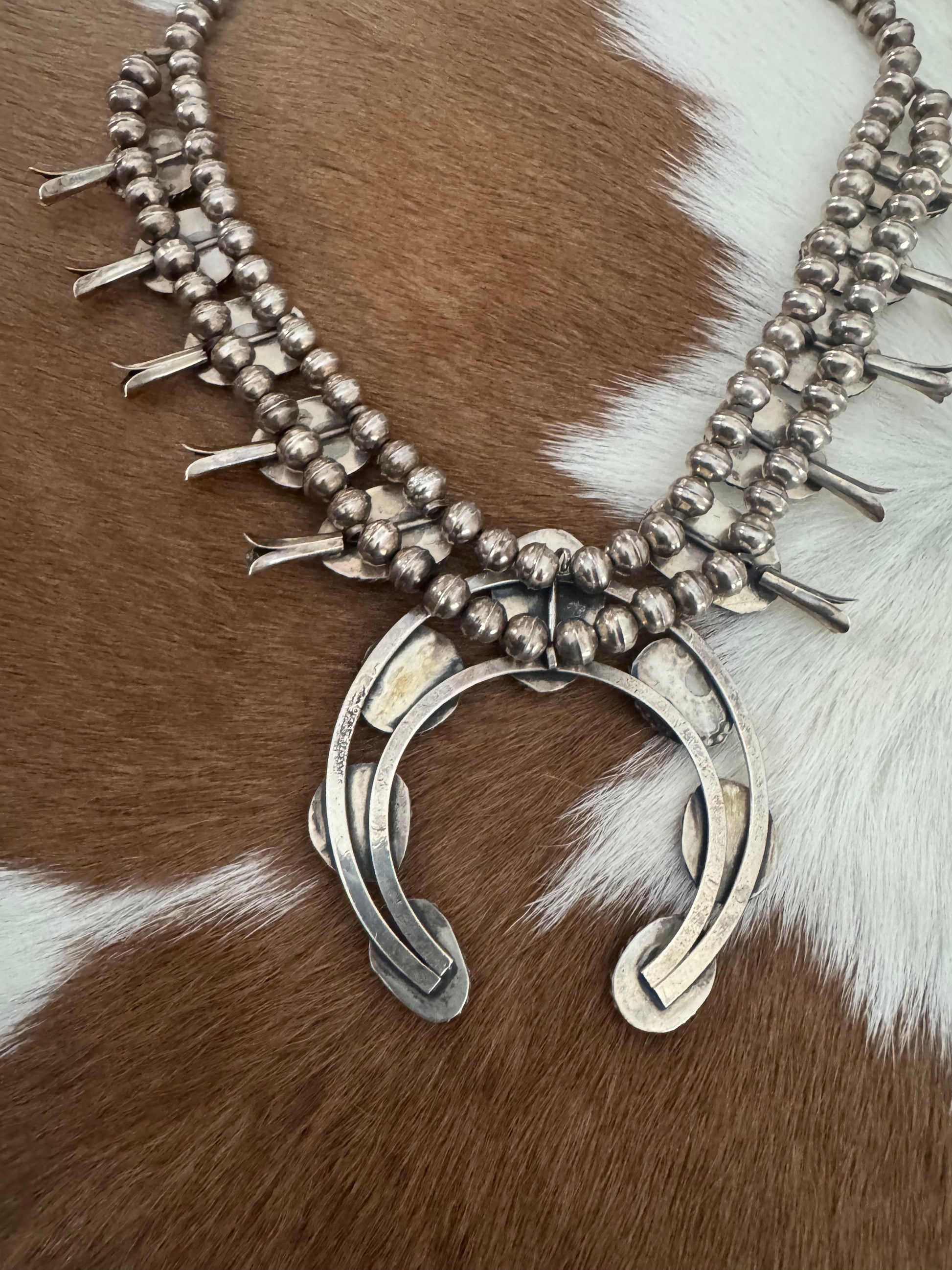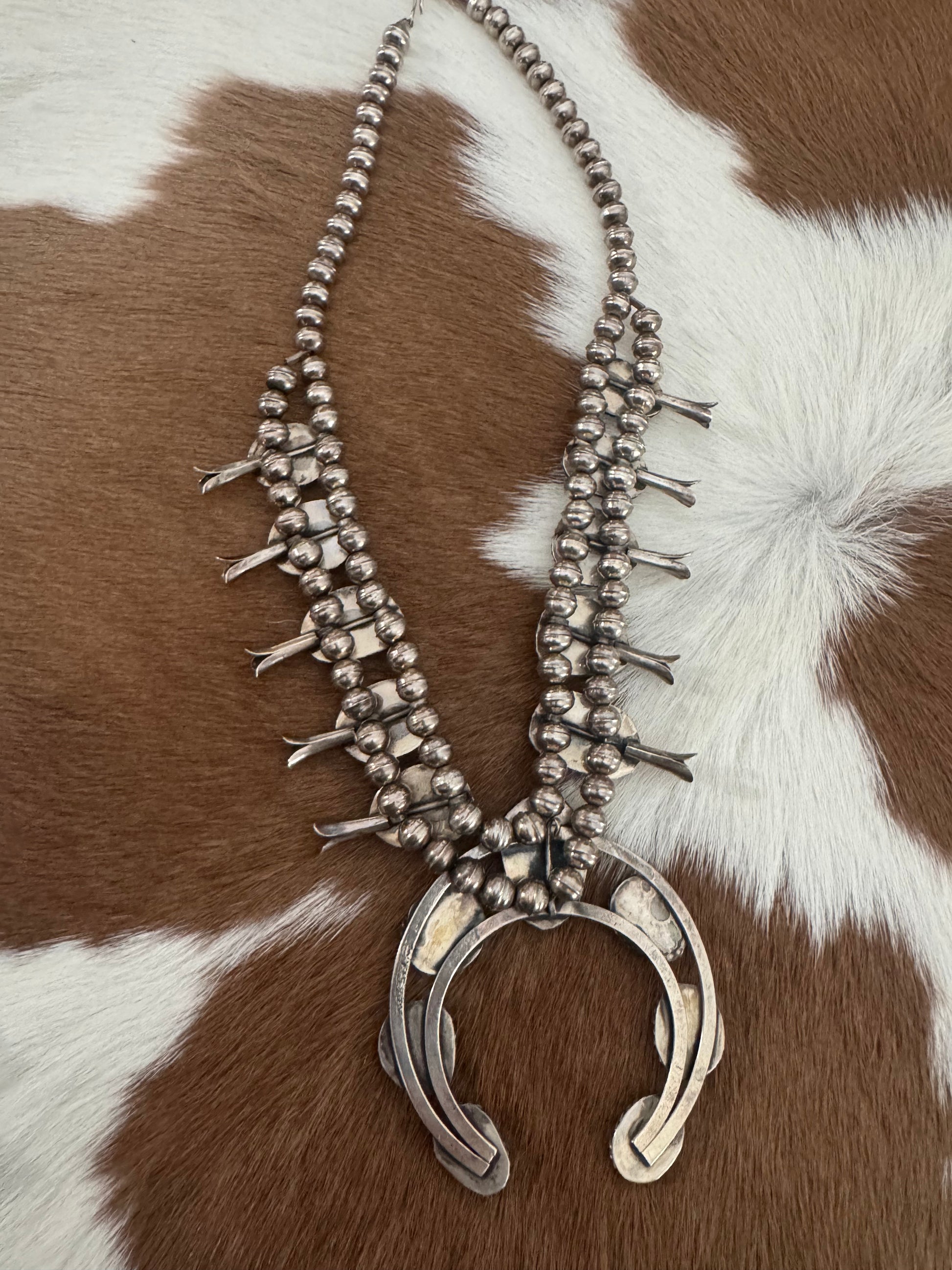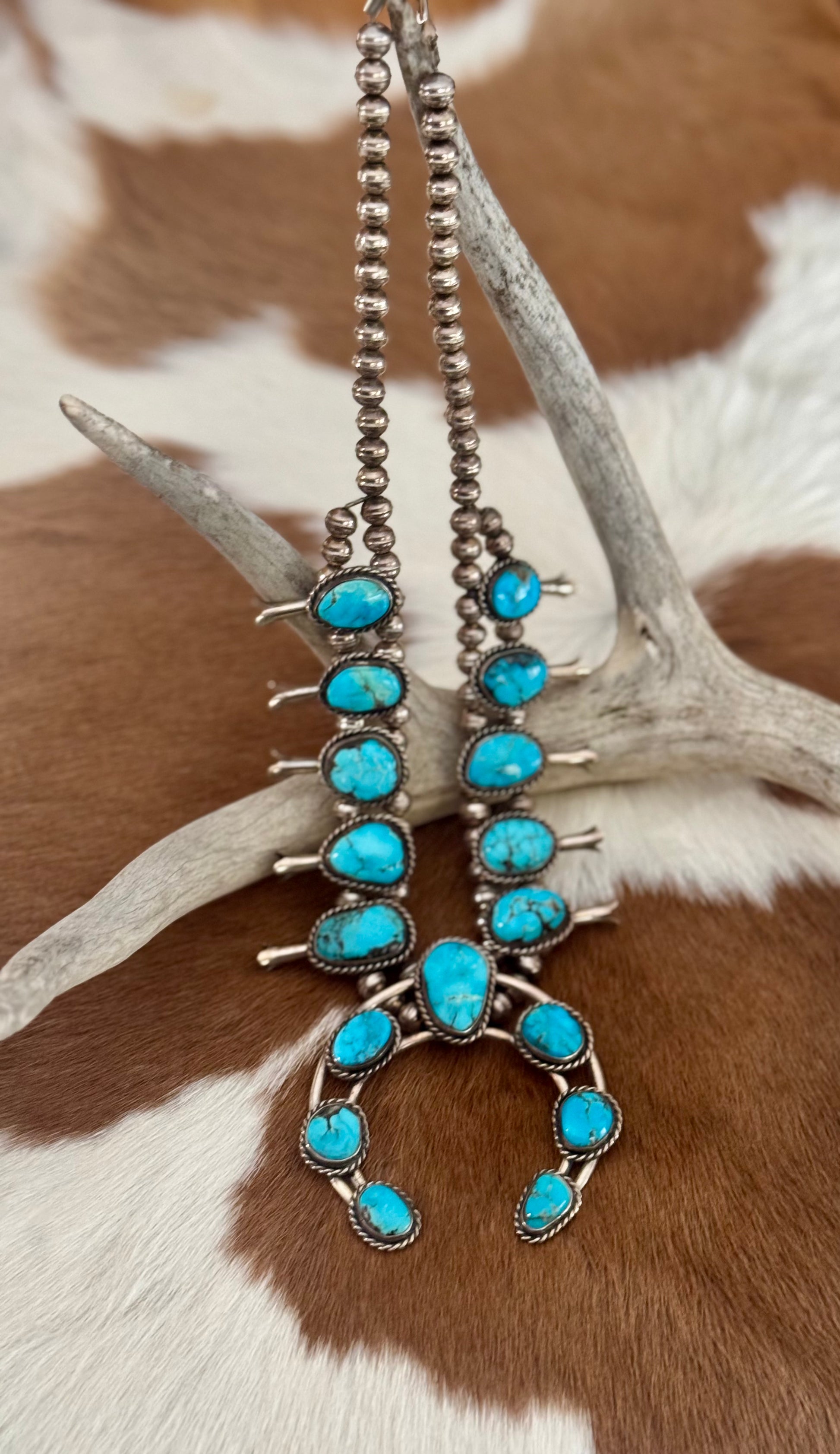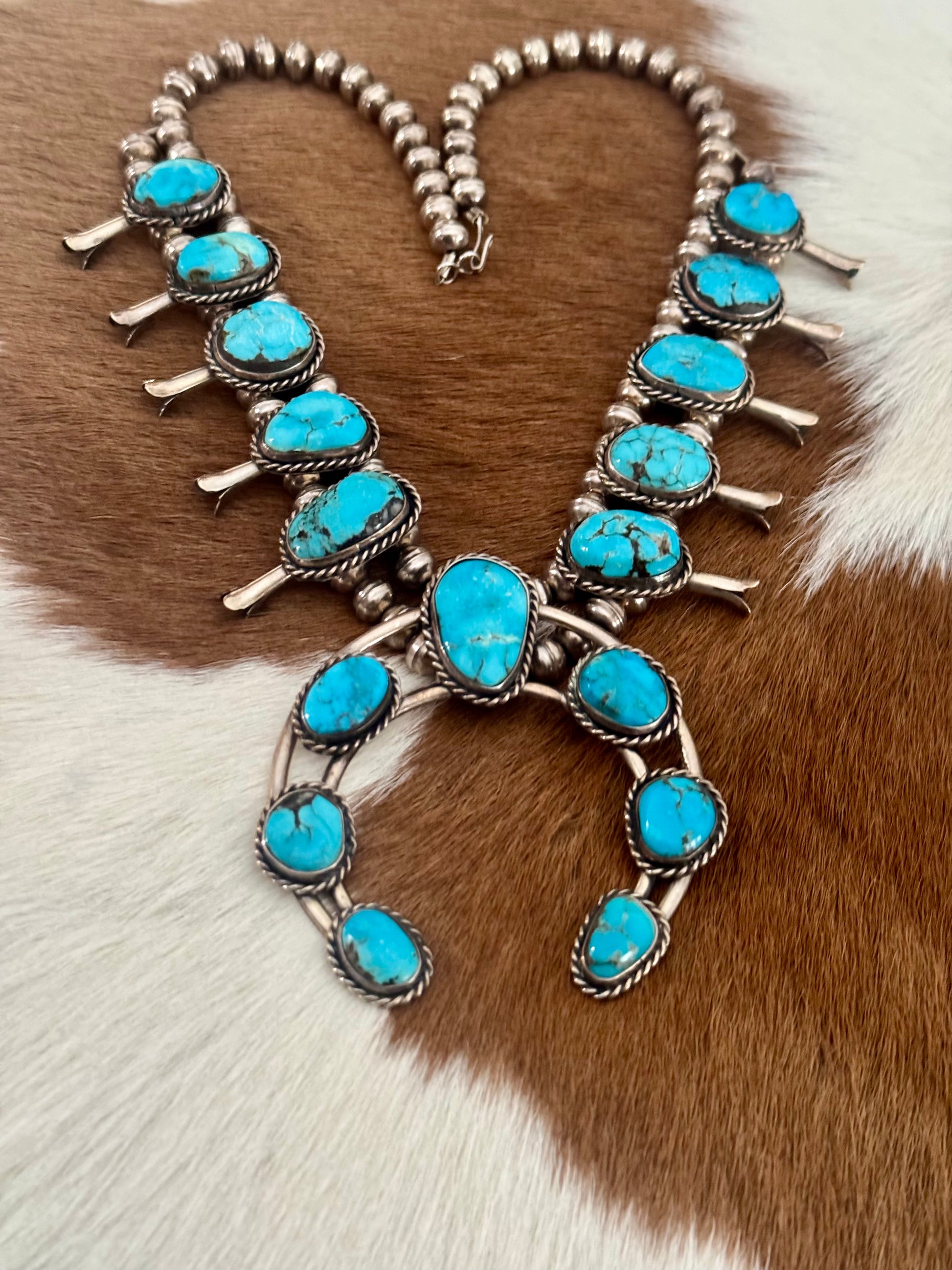 This beautiful Squash Blossom Necklace is for sure going to turn heads. Its beautiful all natural Turquoise with a deep blue and pure Sterling Silver craftsmanship makes this truly one of a kind. This piece is not stamped, however has been tested and is Sterling Silver.