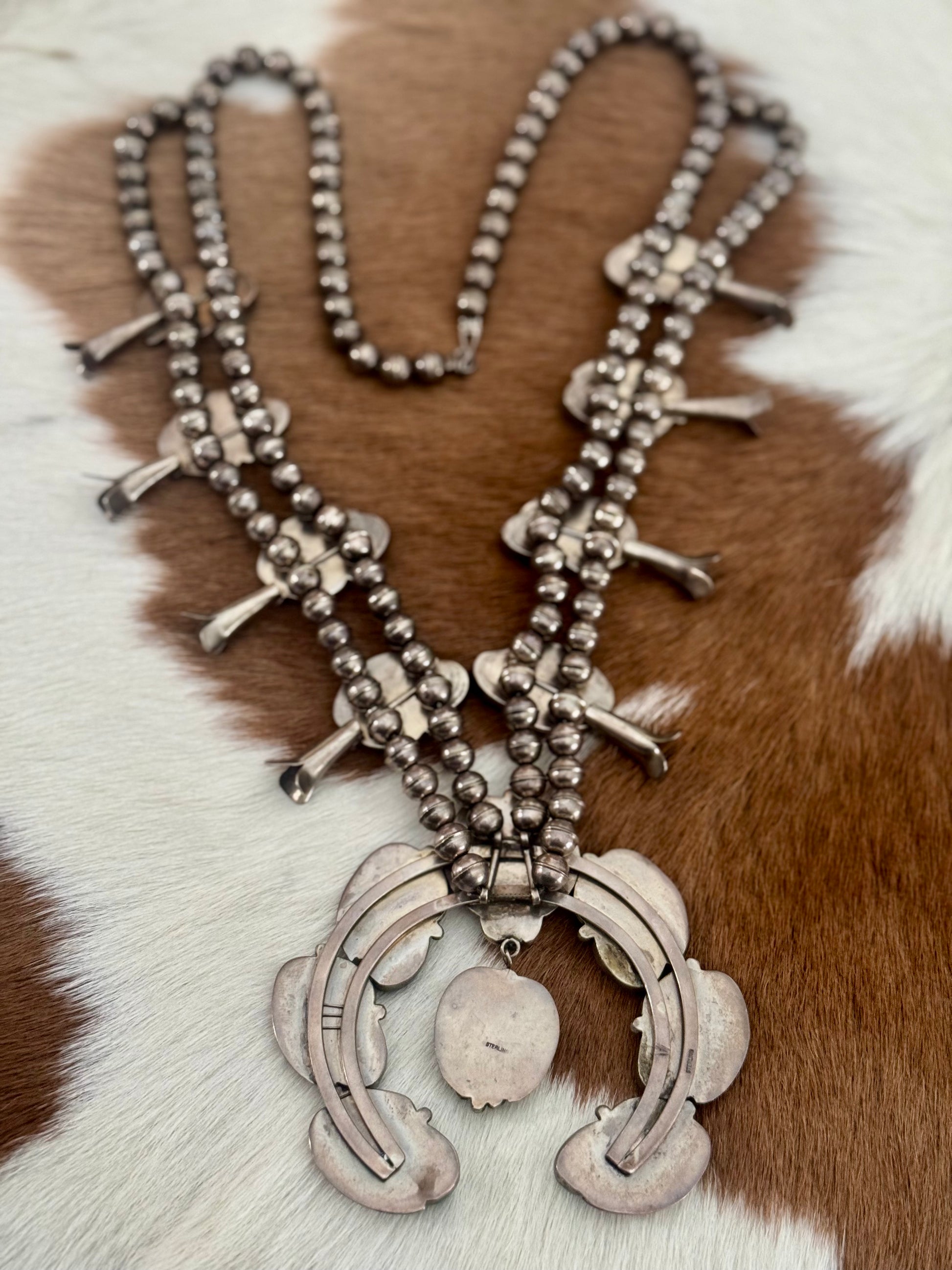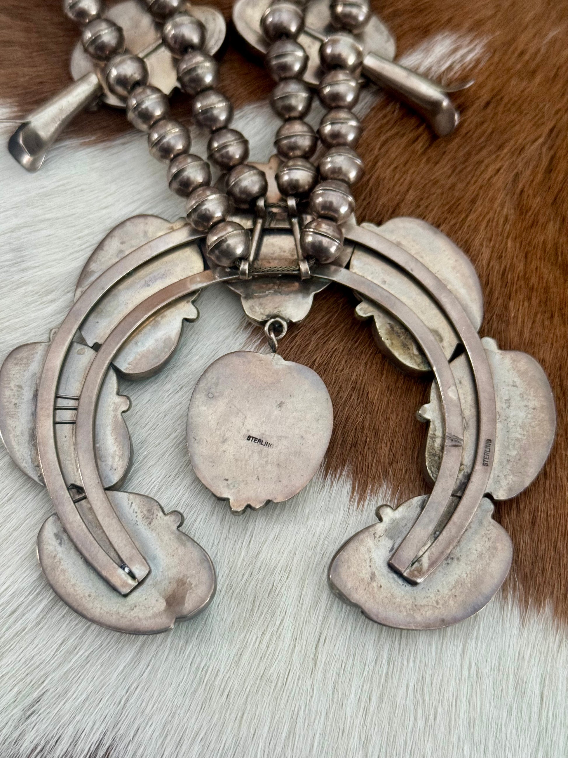 ONE OF A KIND. This beautiful Squash Blossom Necklace has beautiful detailing. With genuine Turquoise and Sterling Silver this VINTAGE piece of art will be the highlight of your outfit.
